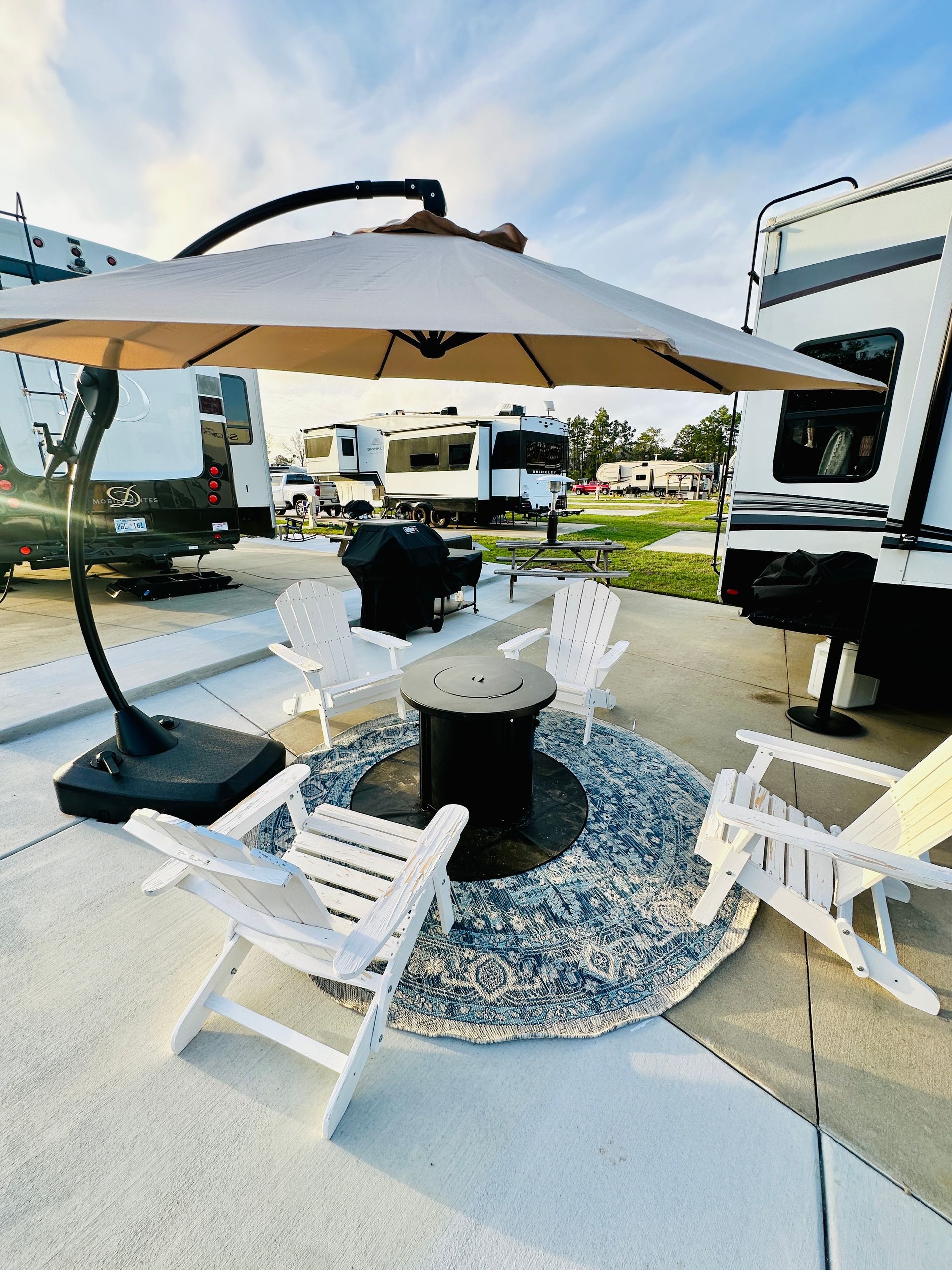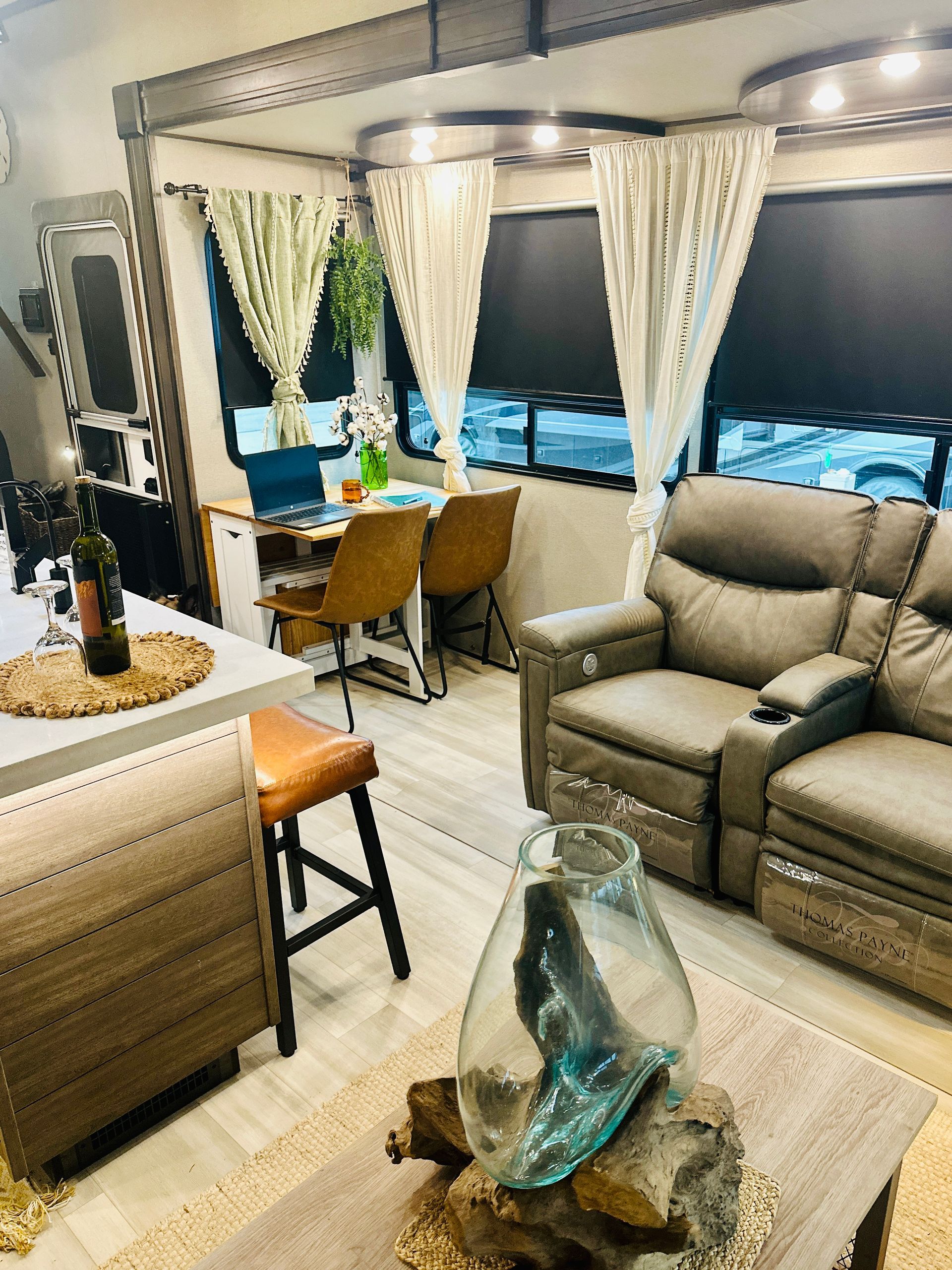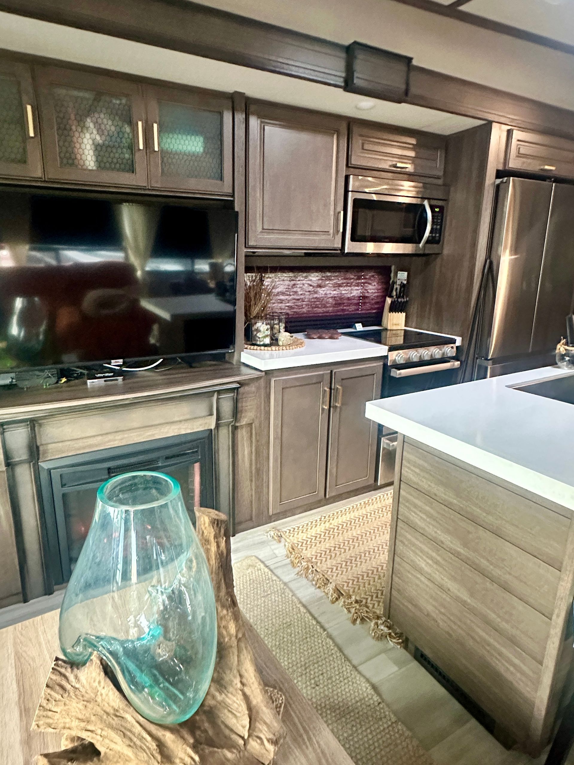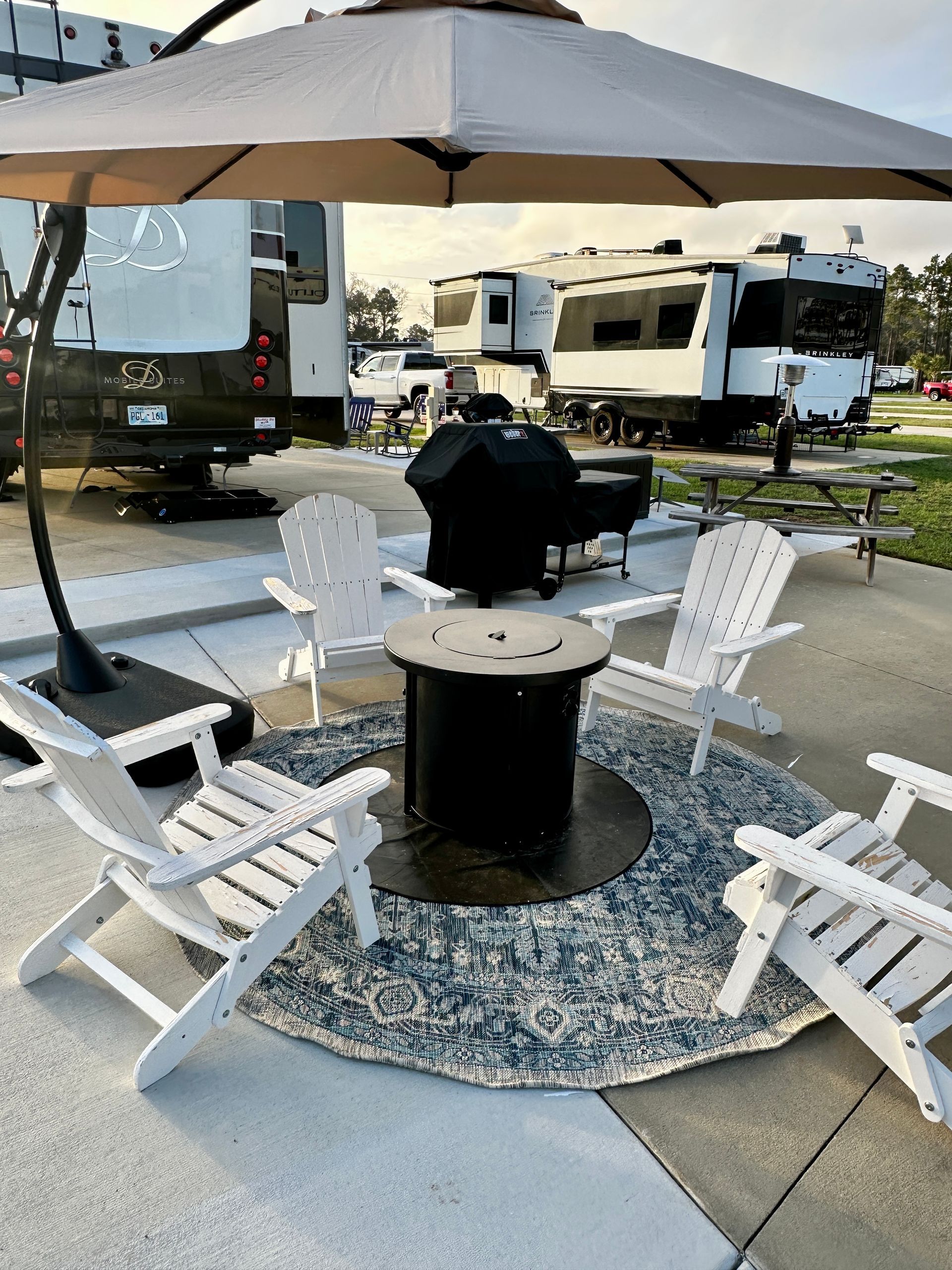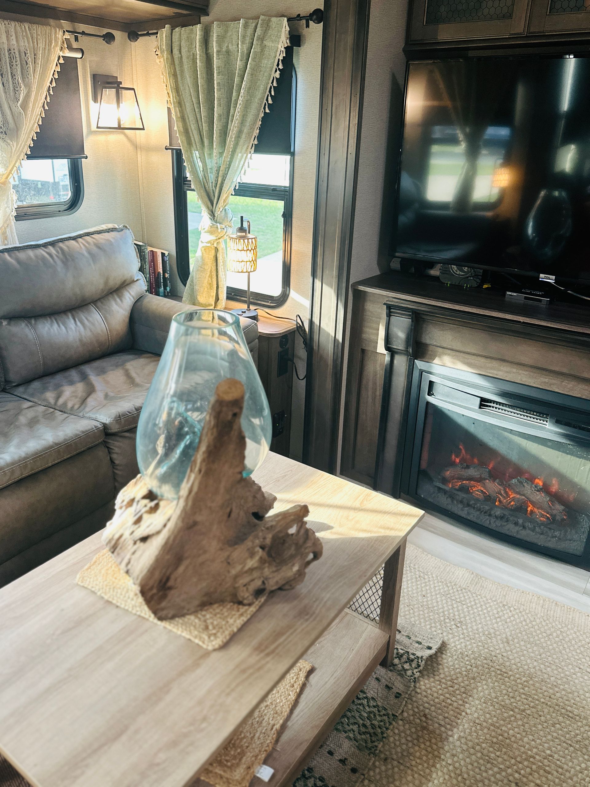 What’s Included: Besides the amazing Resort pool access, this glamper is thoughtfully stocked so you can travel light. Amenities include fully equipped kitchen with all the small appliances and cookware you can imagine, glassware and plastic ware, Indoor and outdoor grilling options (1 propane grill and 1 small charcoal grill), air fryer, crock pot, Roasting Pan, linens, beach towels, games, beach gear, Outdoor seating, 2 fire pits, picnic table, an outdoor heater, indoor fireplace, Residential stainless steel refrigerator with ice maker, Massaging Recliners, and many household essentials.
