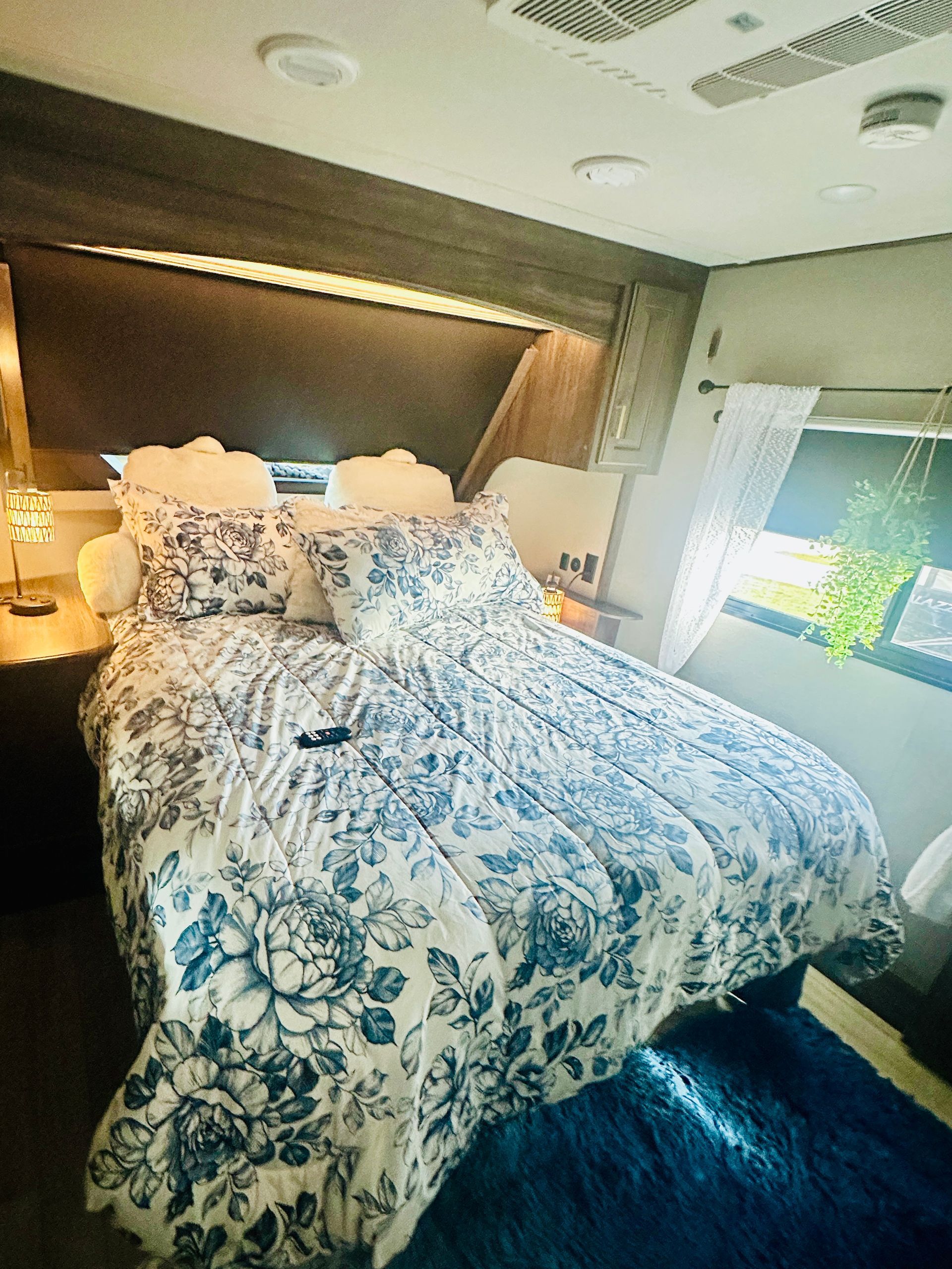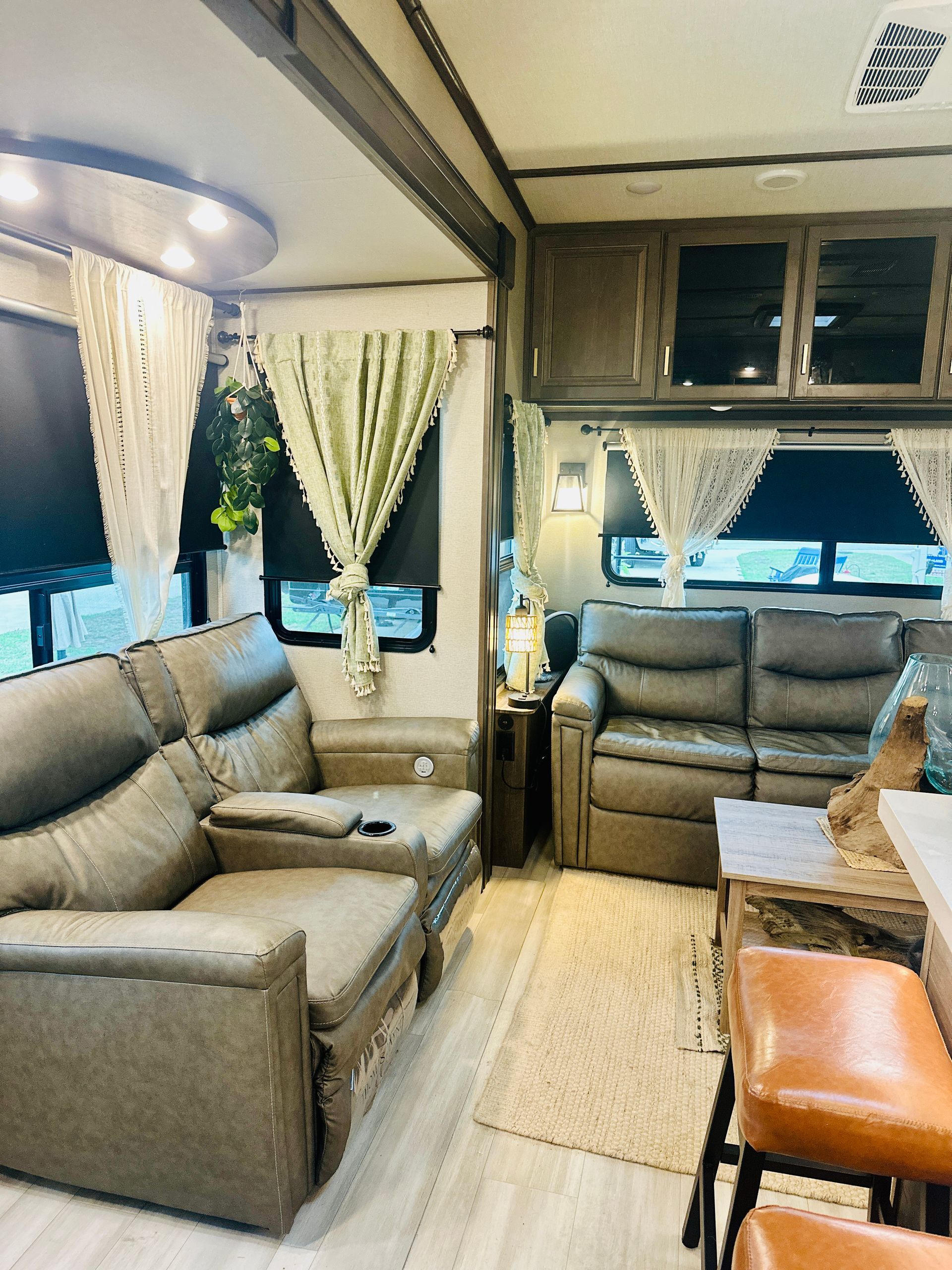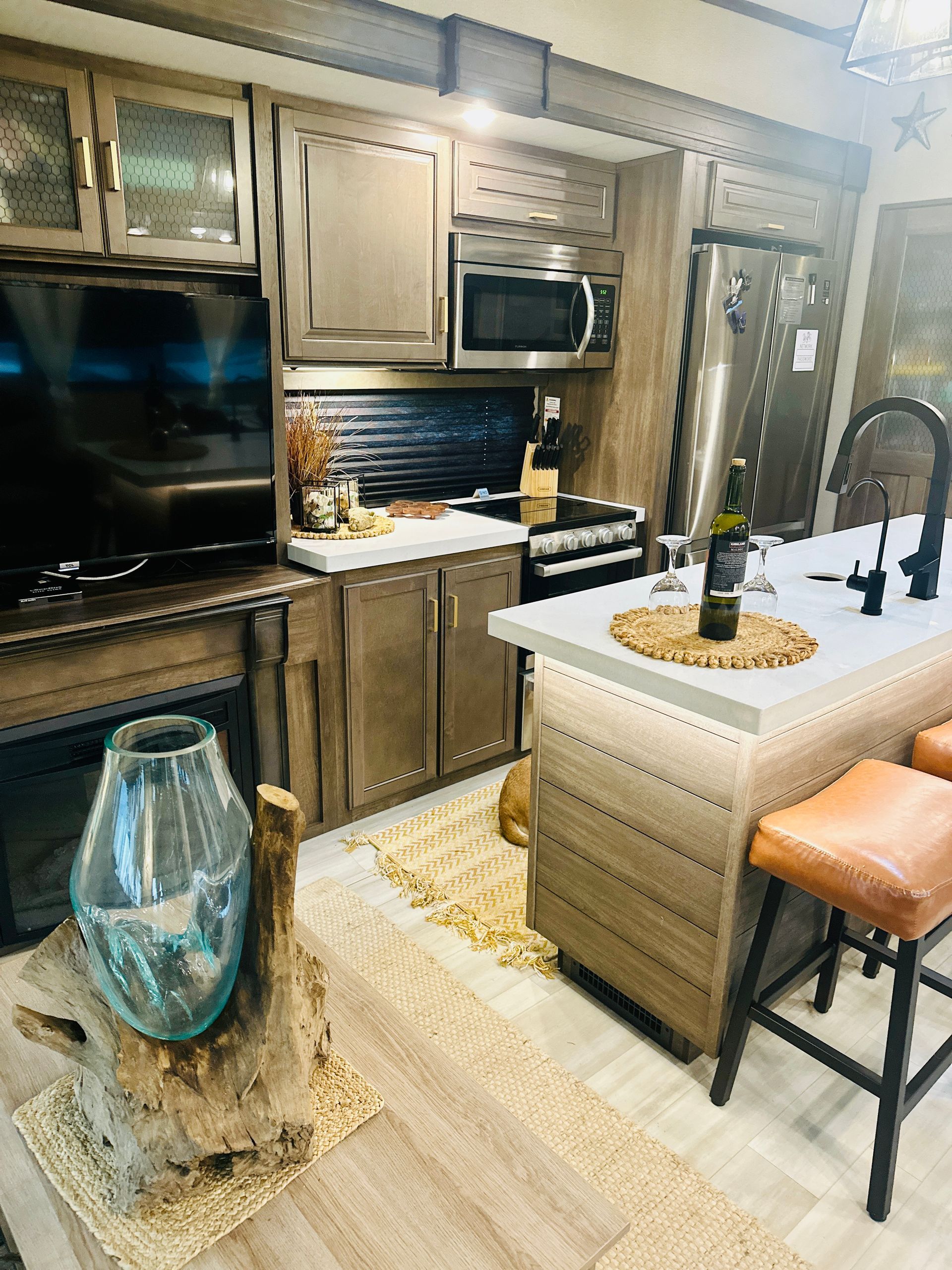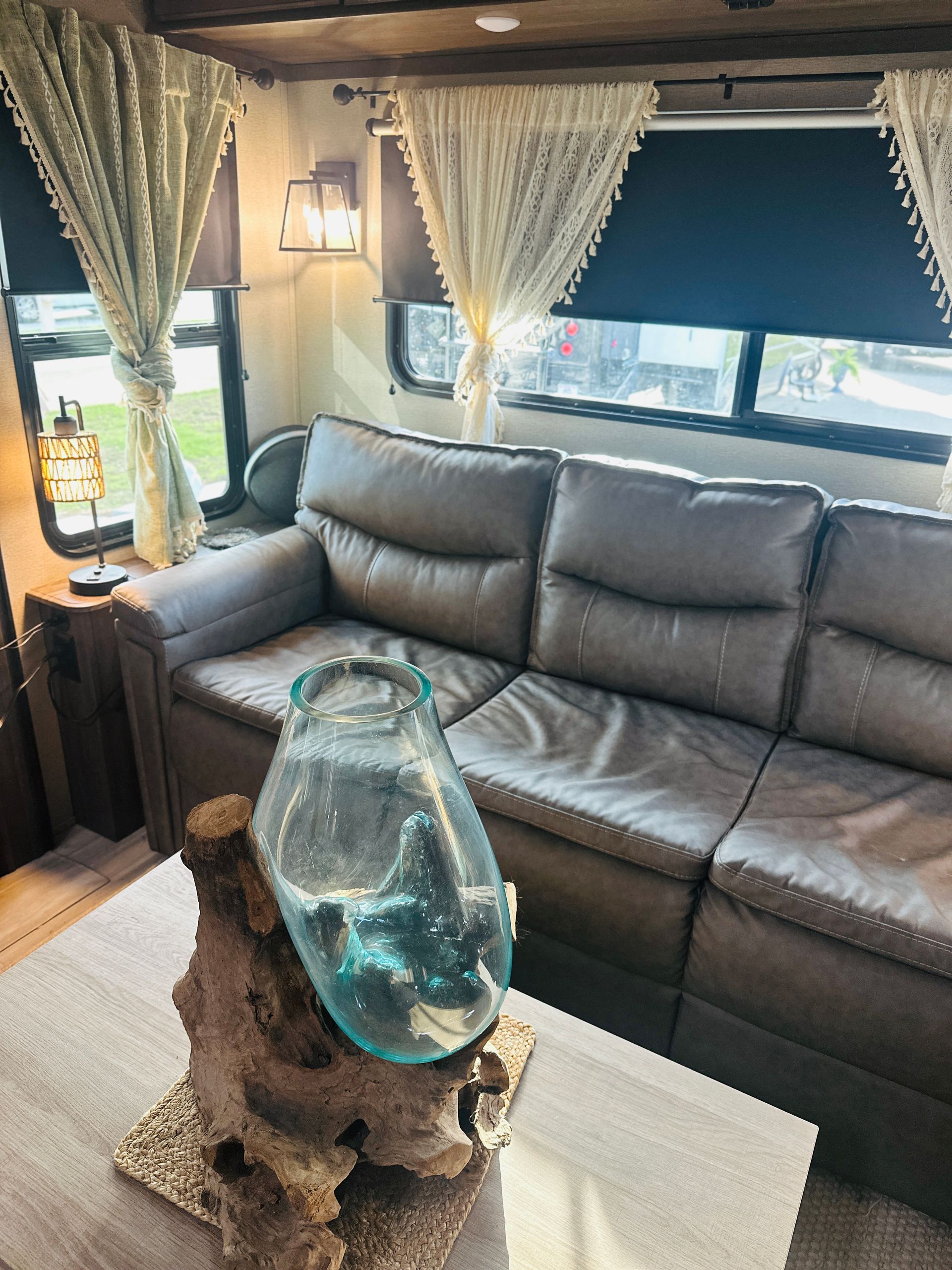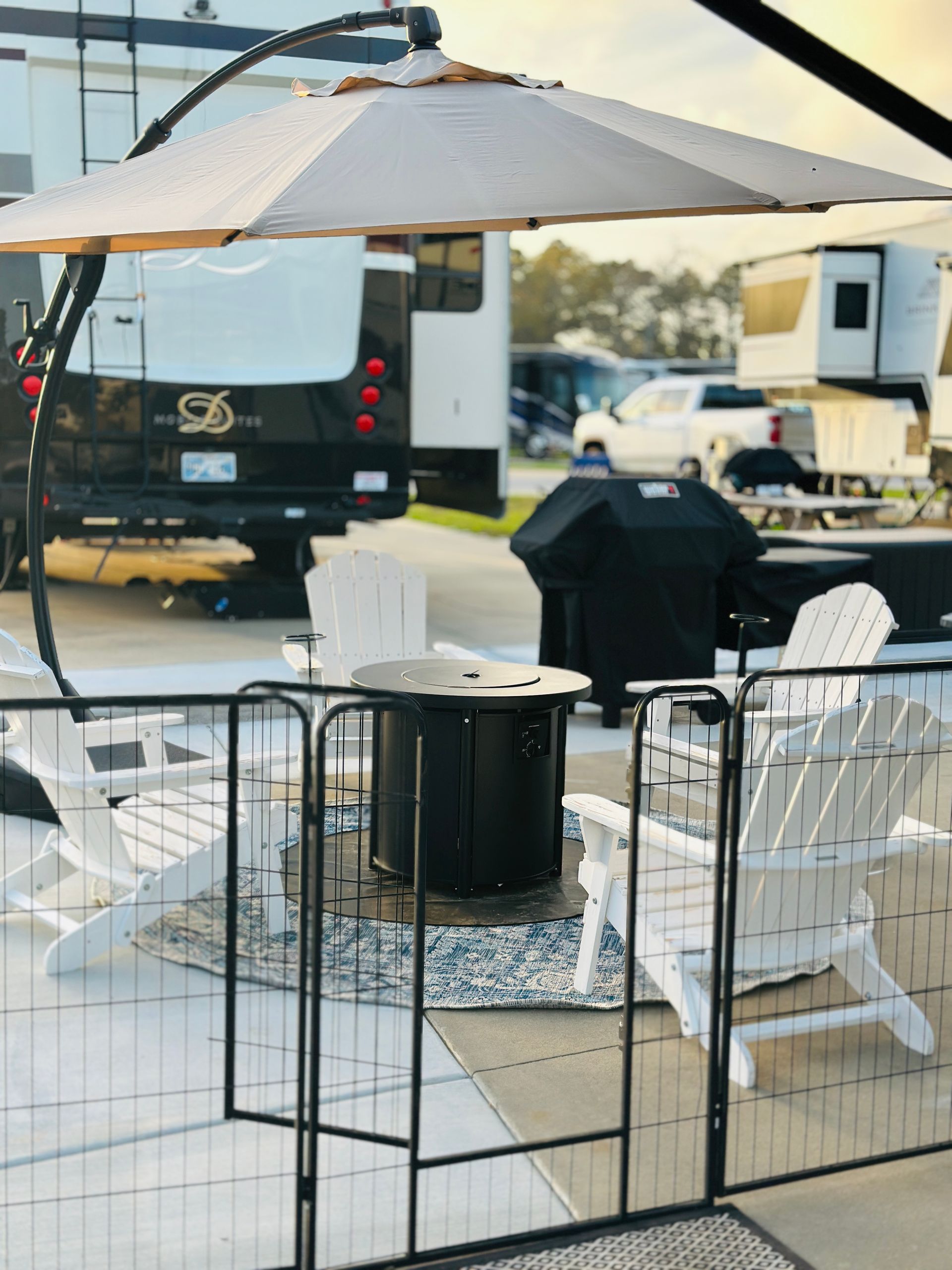 What’s Included: Besides the amazing Resort pool access, this glamper is thoughtfully stocked so you can travel light. Amenities include fully equipped kitchen with all the small appliances and cookware you can imagine, glassware and plastic ware, Indoor and outdoor grilling options (1 propane grill and 1 small charcoal grill), air fryer, crock pot, Roasting Pan, linens, beach towels, games, beach gear, Outdoor seating, 2 fire pits, picnic table, an outdoor heater, indoor fireplace, Residential stainless steel refrigerator with ice maker, Massaging Recliners, and many household essentials.