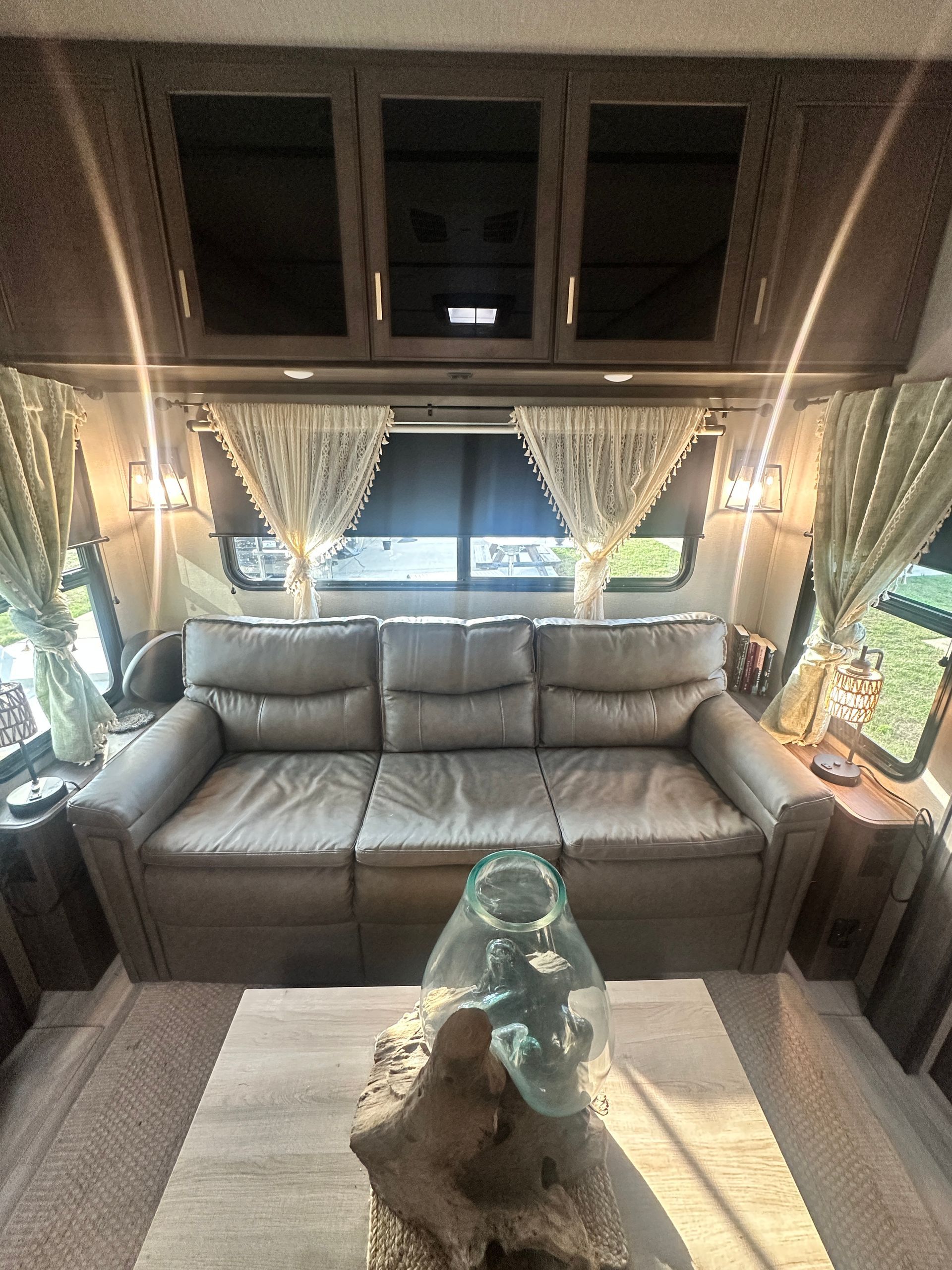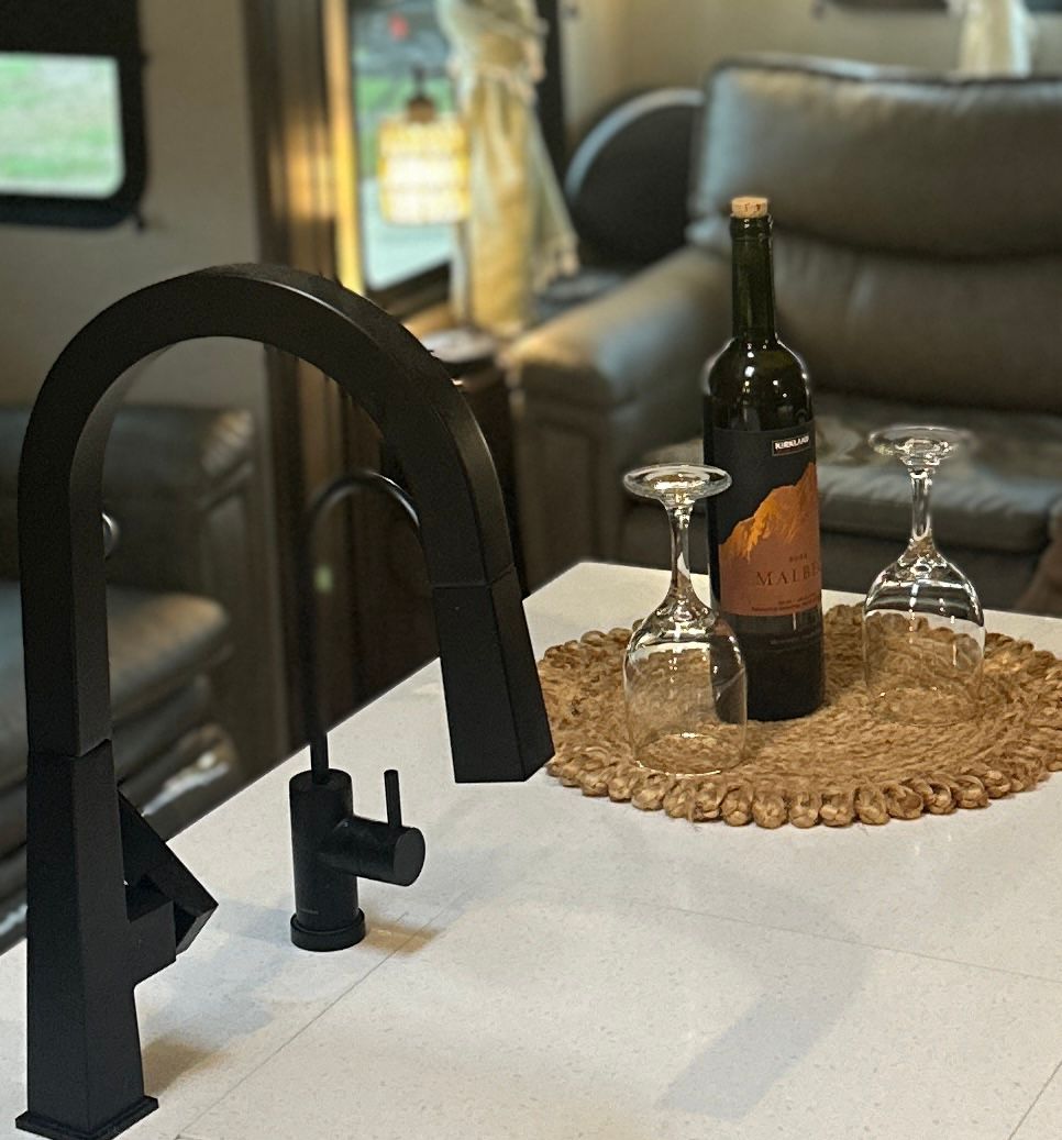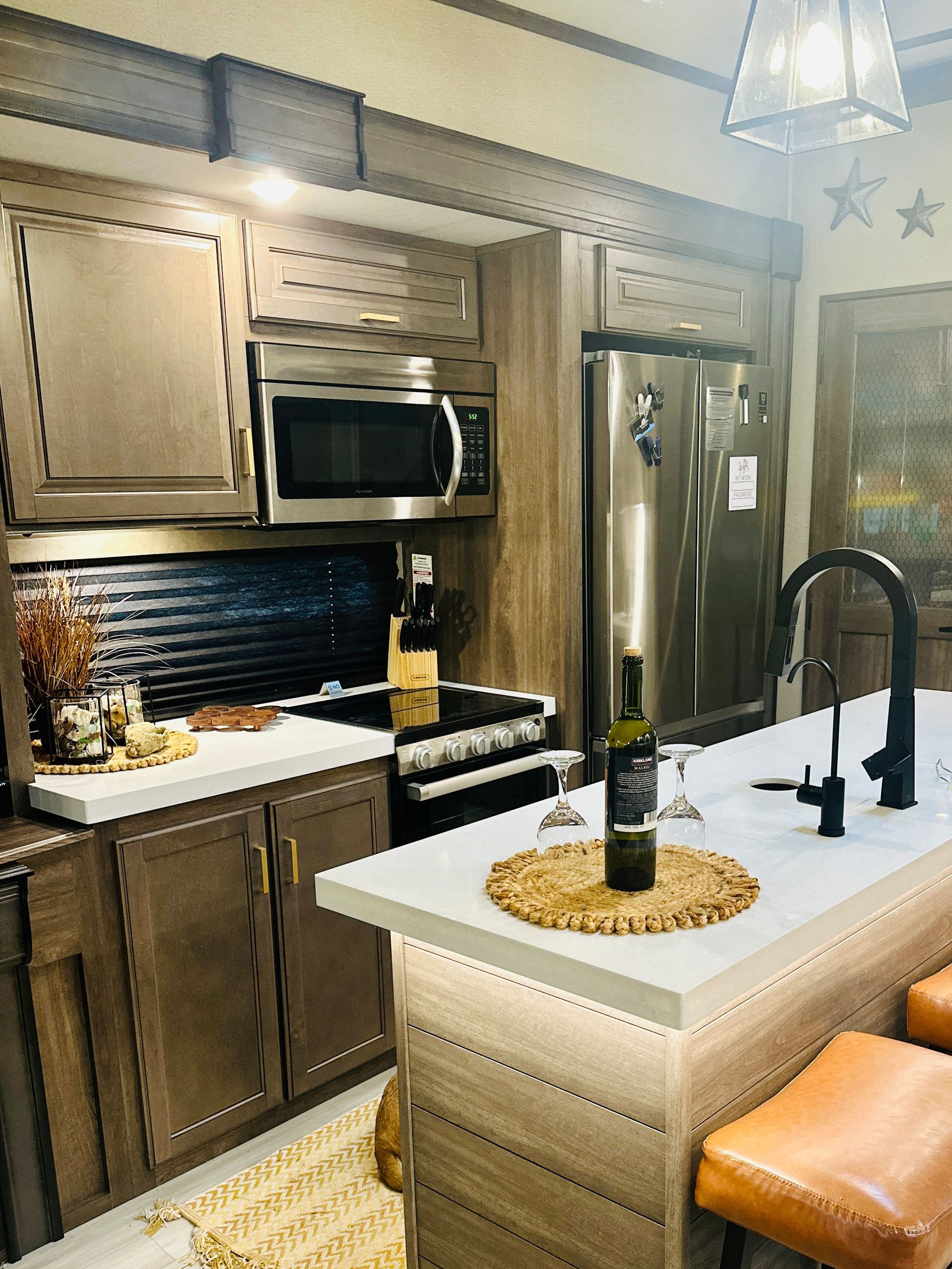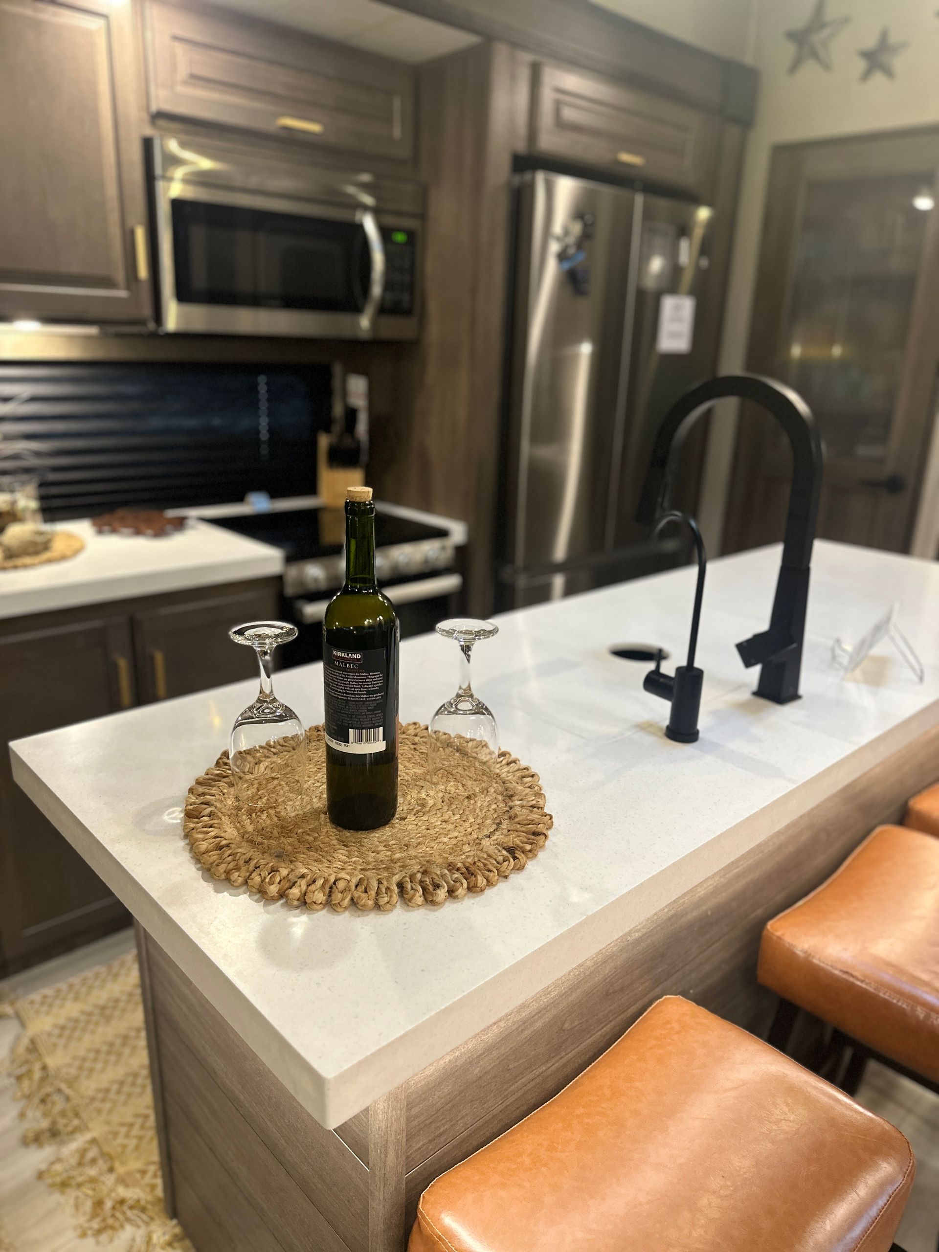 What’s Included: Besides the amazing Resort pool access, this glamper is thoughtfully stocked so you can travel light. Amenities include fully equipped kitchen with all the small appliances and cookware you can imagine, glassware and plastic ware, Indoor and outdoor grilling options (1 propane grill and 1 small charcoal grill), air fryer, crock pot, Roasting Pan, linens, beach towels, games, beach gear, Outdoor seating, 2 fire pits, picnic table, an outdoor heater, indoor fireplace, Residential stainless steel refrigerator with ice maker, Massaging Recliners, and many household essentials.