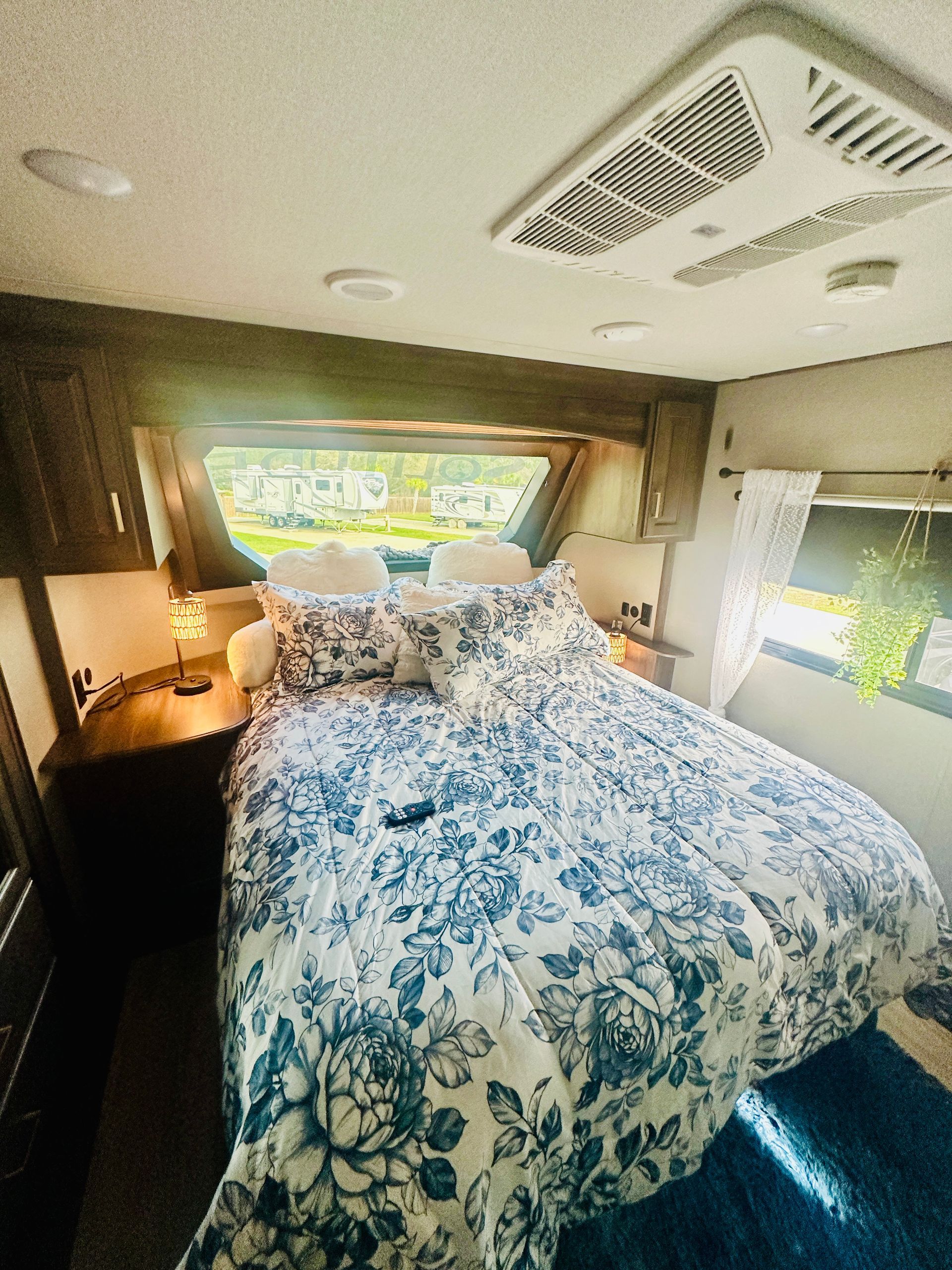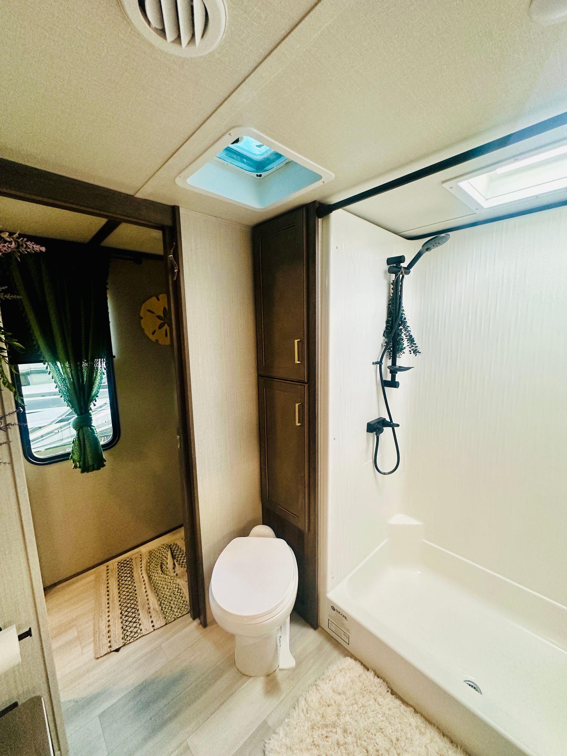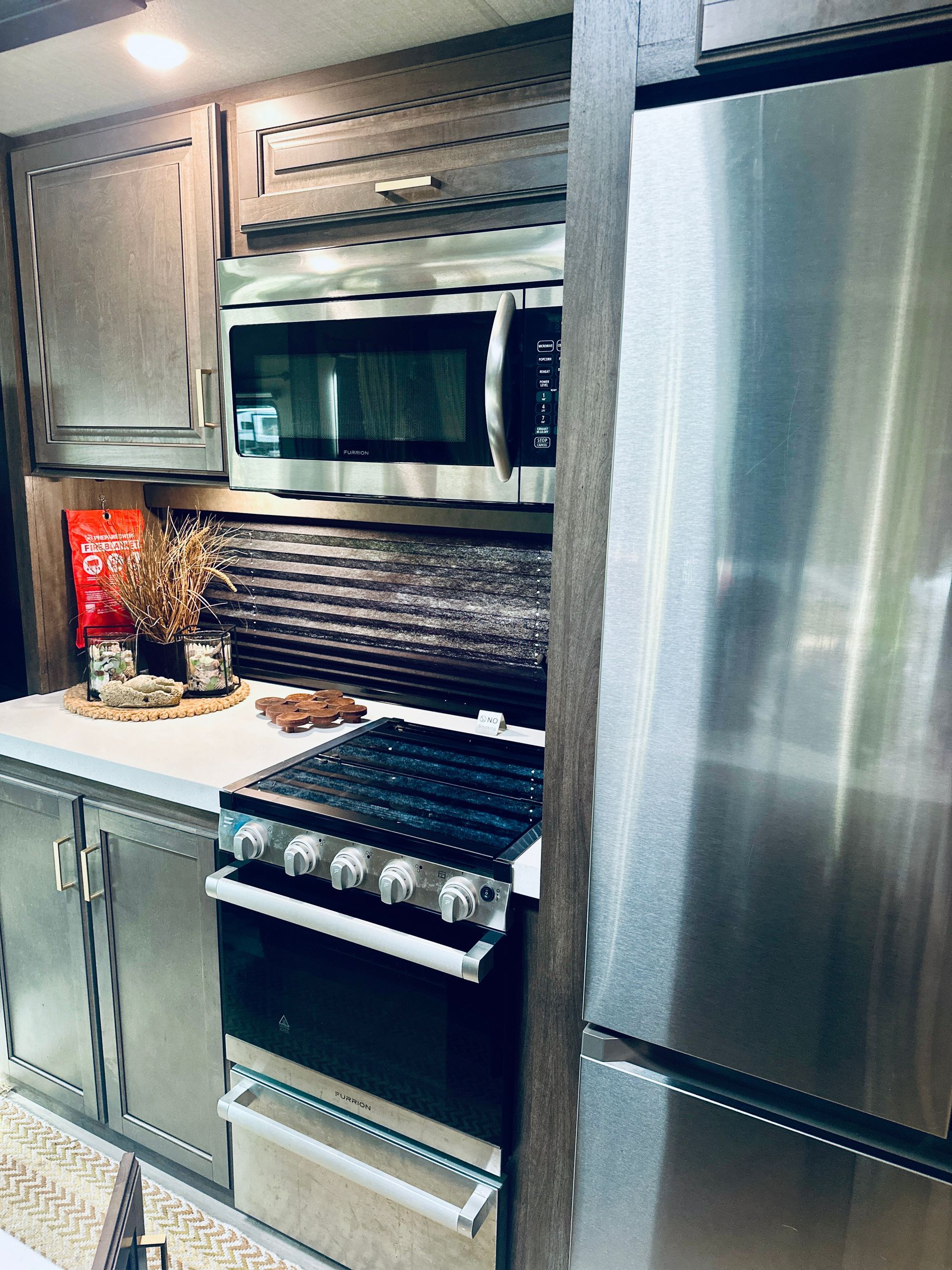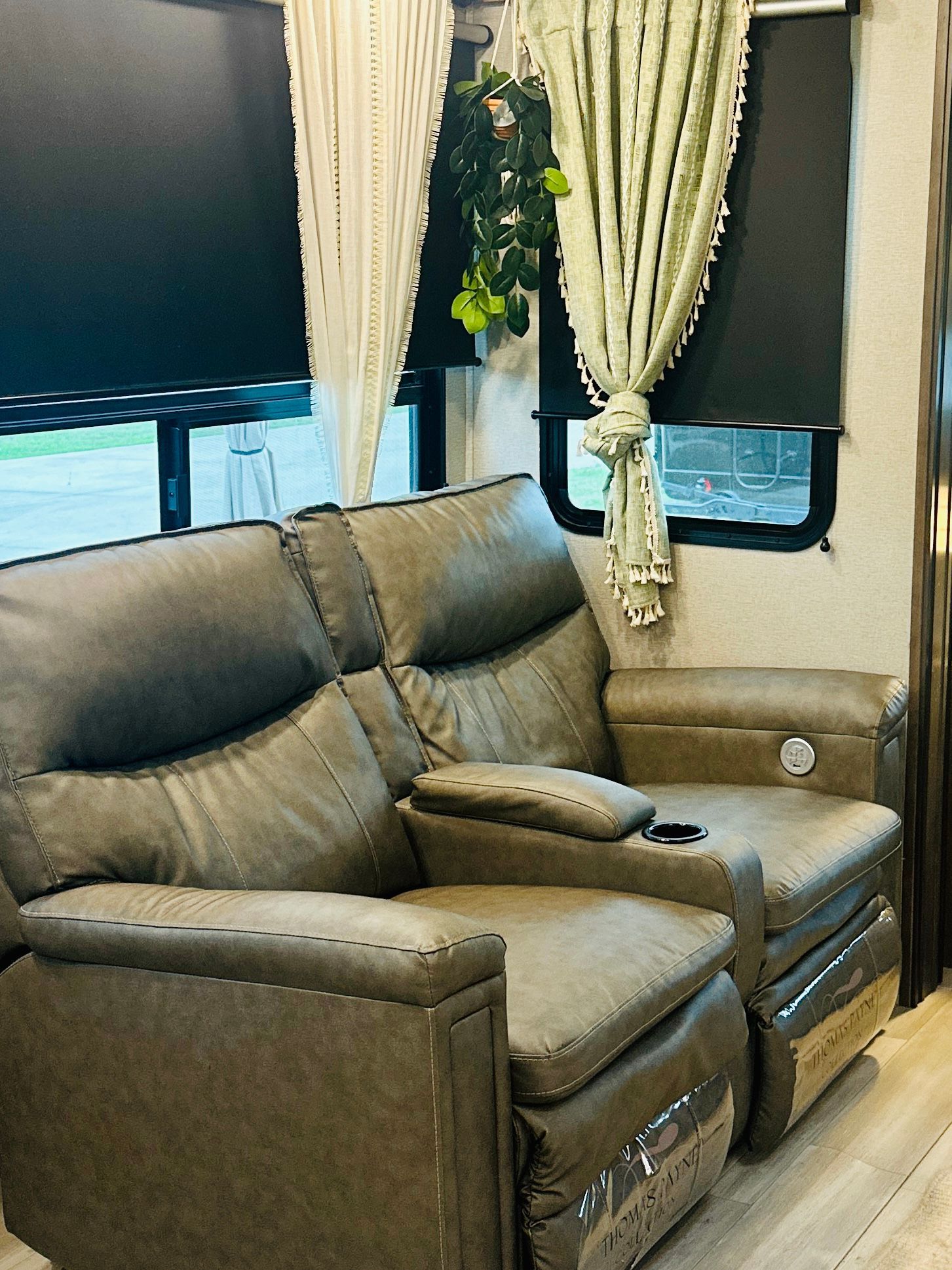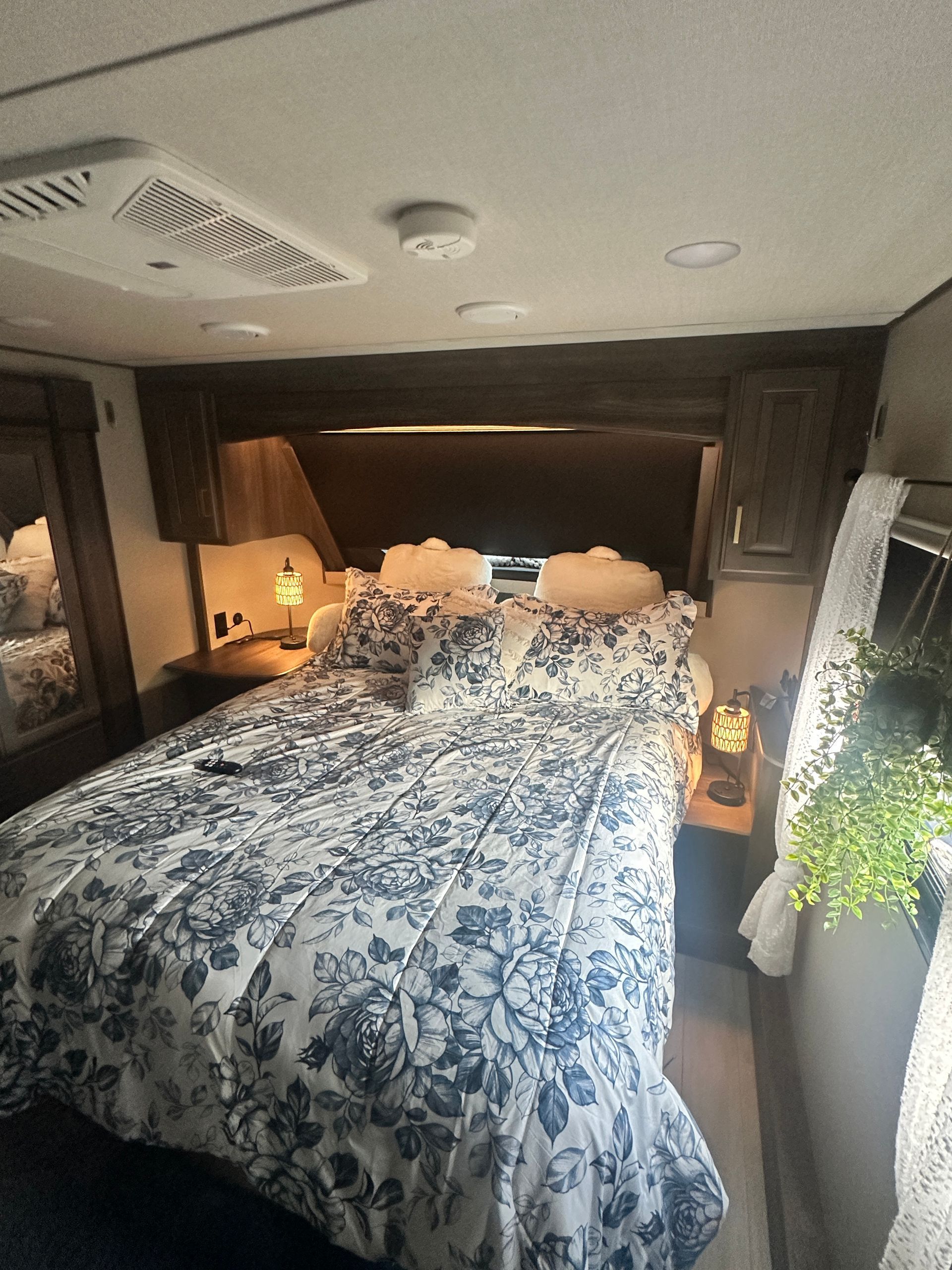 What’s Included: Besides the amazing Resort pool access, this glamper is thoughtfully stocked so you can travel light. Amenities include fully equipped kitchen with all the small appliances and cookware you can imagine, glassware and plastic ware, Indoor and outdoor grilling options (1 propane grill and 1 small charcoal grill), air fryer, crock pot, Roasting Pan, linens, beach towels, games, beach gear, Outdoor seating, 2 fire pits, picnic table, an outdoor heater, indoor fireplace, Residential stainless steel refrigerator with ice maker, Massaging Recliners, and many household essentials.