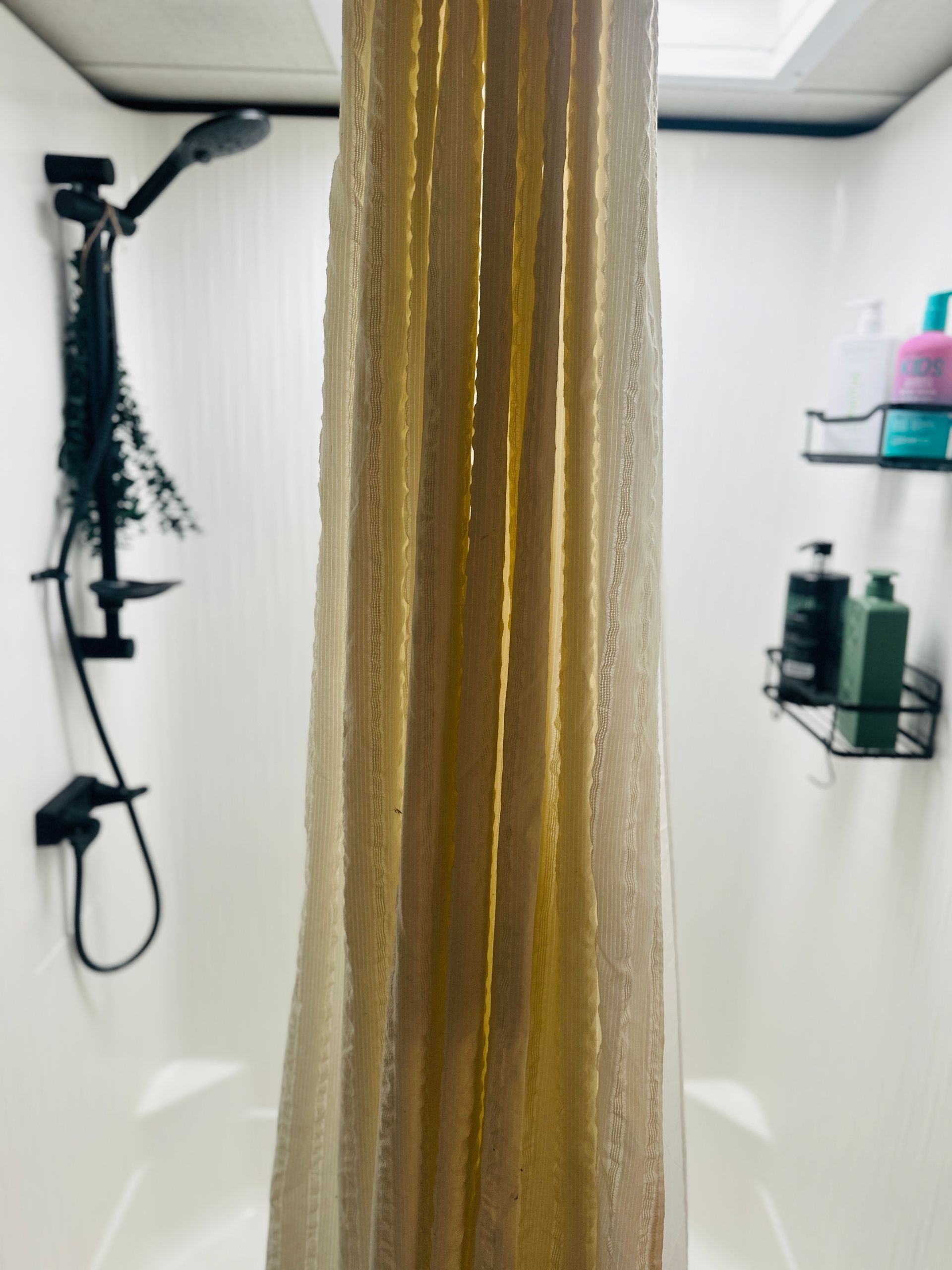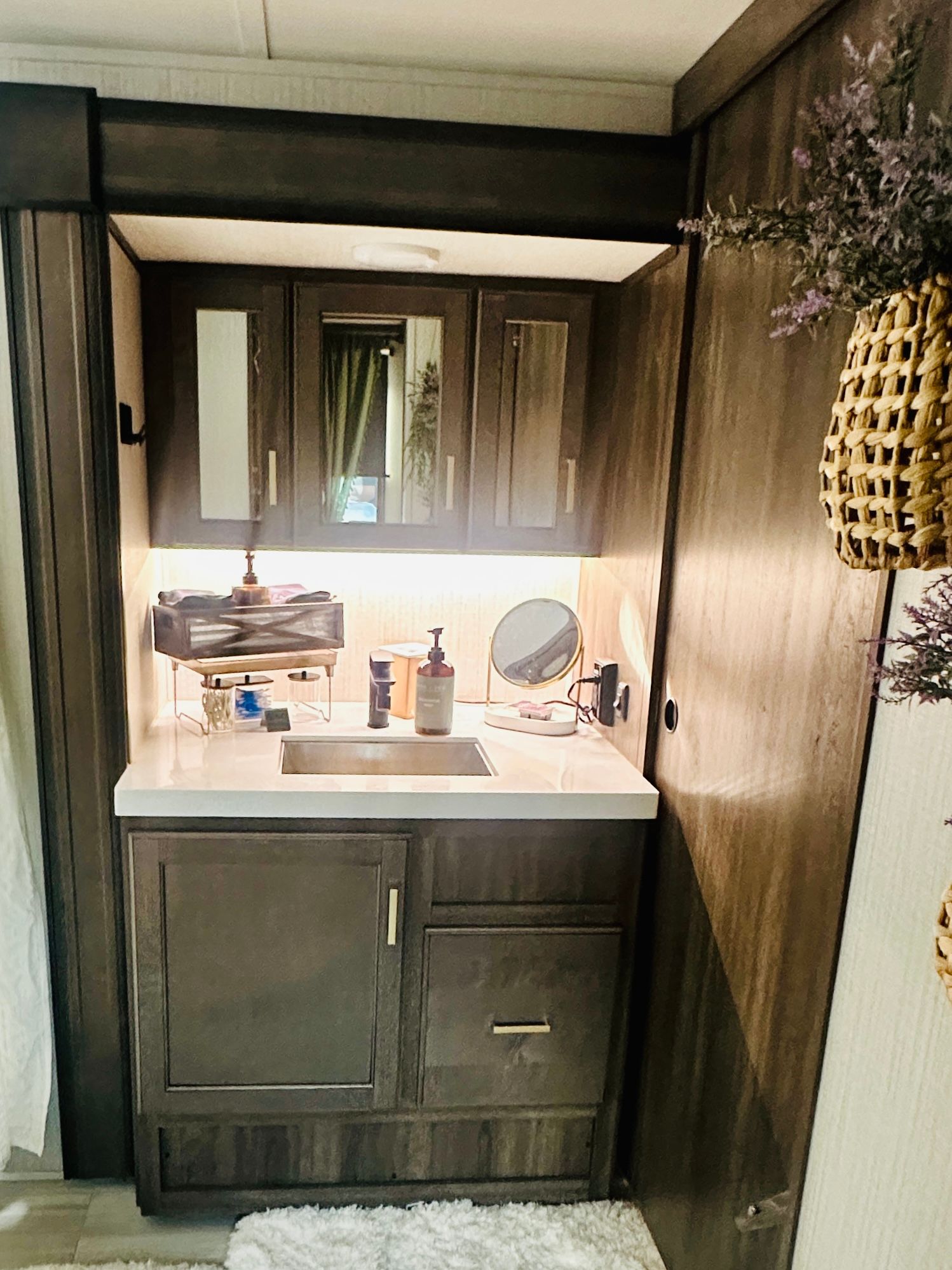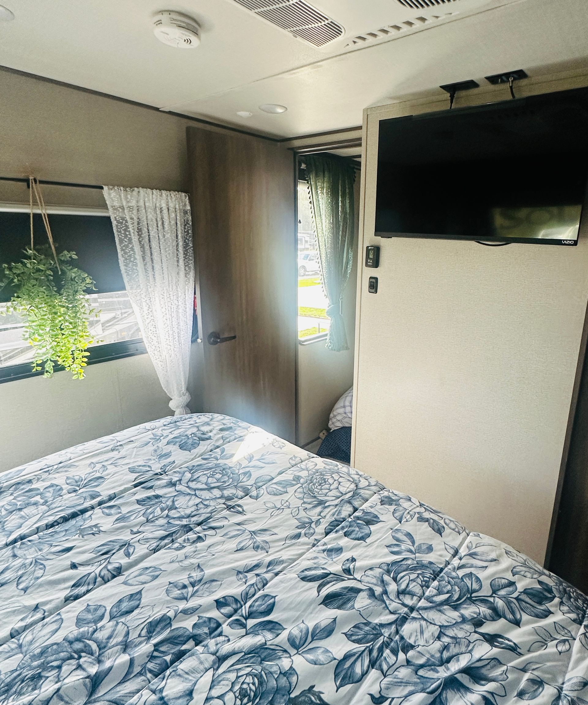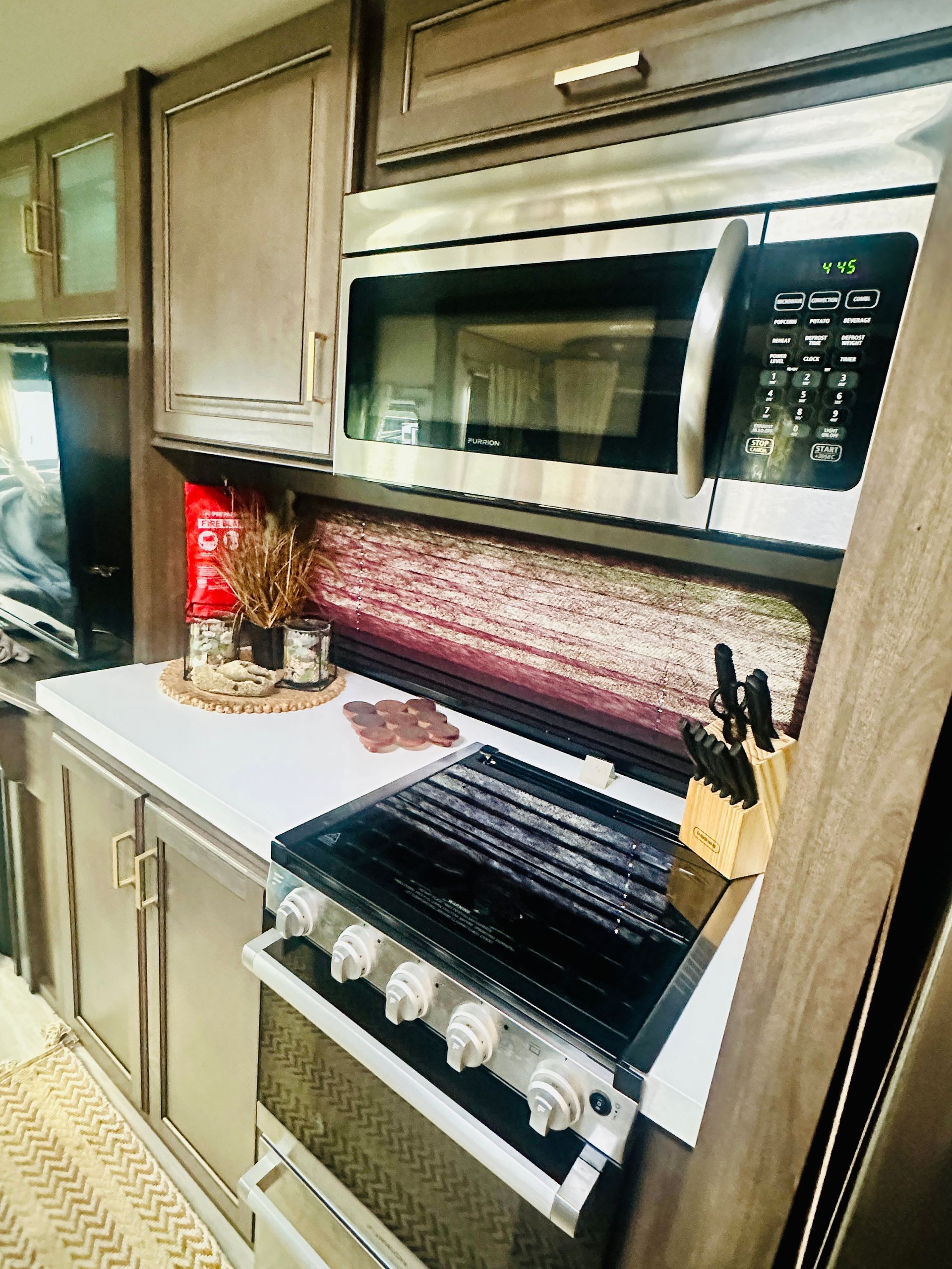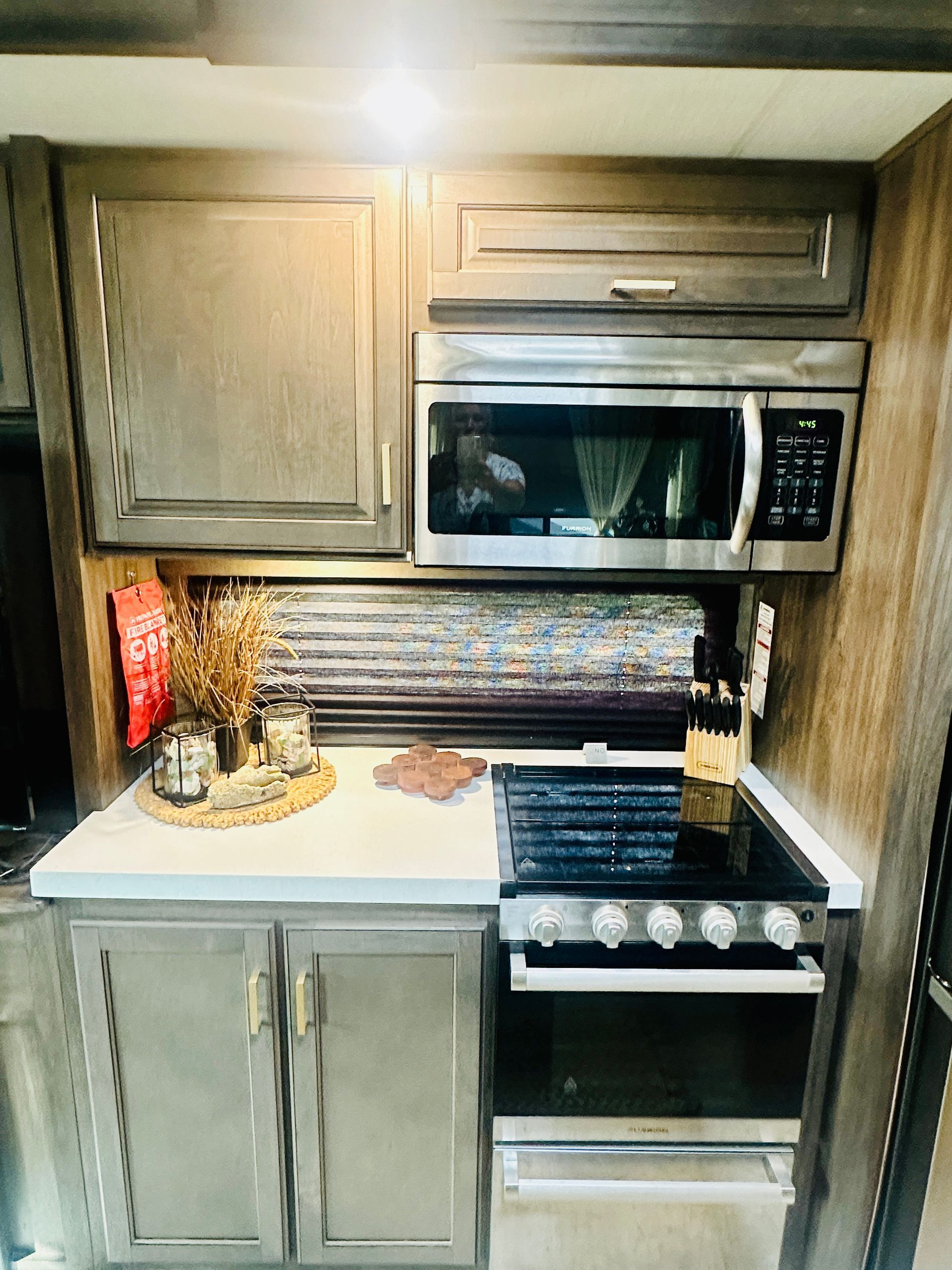 What’s Included: Besides the amazing Resort pool access, this glamper is thoughtfully stocked so you can travel light. Amenities include fully equipped kitchen with all the small appliances and cookware you can imagine, glassware and plastic ware, Indoor and outdoor grilling options (1 propane grill and 1 small charcoal grill), air fryer, crock pot, Roasting Pan, linens, beach towels, games, beach gear, Outdoor seating, 2 fire pits, picnic table, an outdoor heater, indoor fireplace, Residential stainless steel refrigerator with ice maker, Massaging Recliners, and many household essentials.